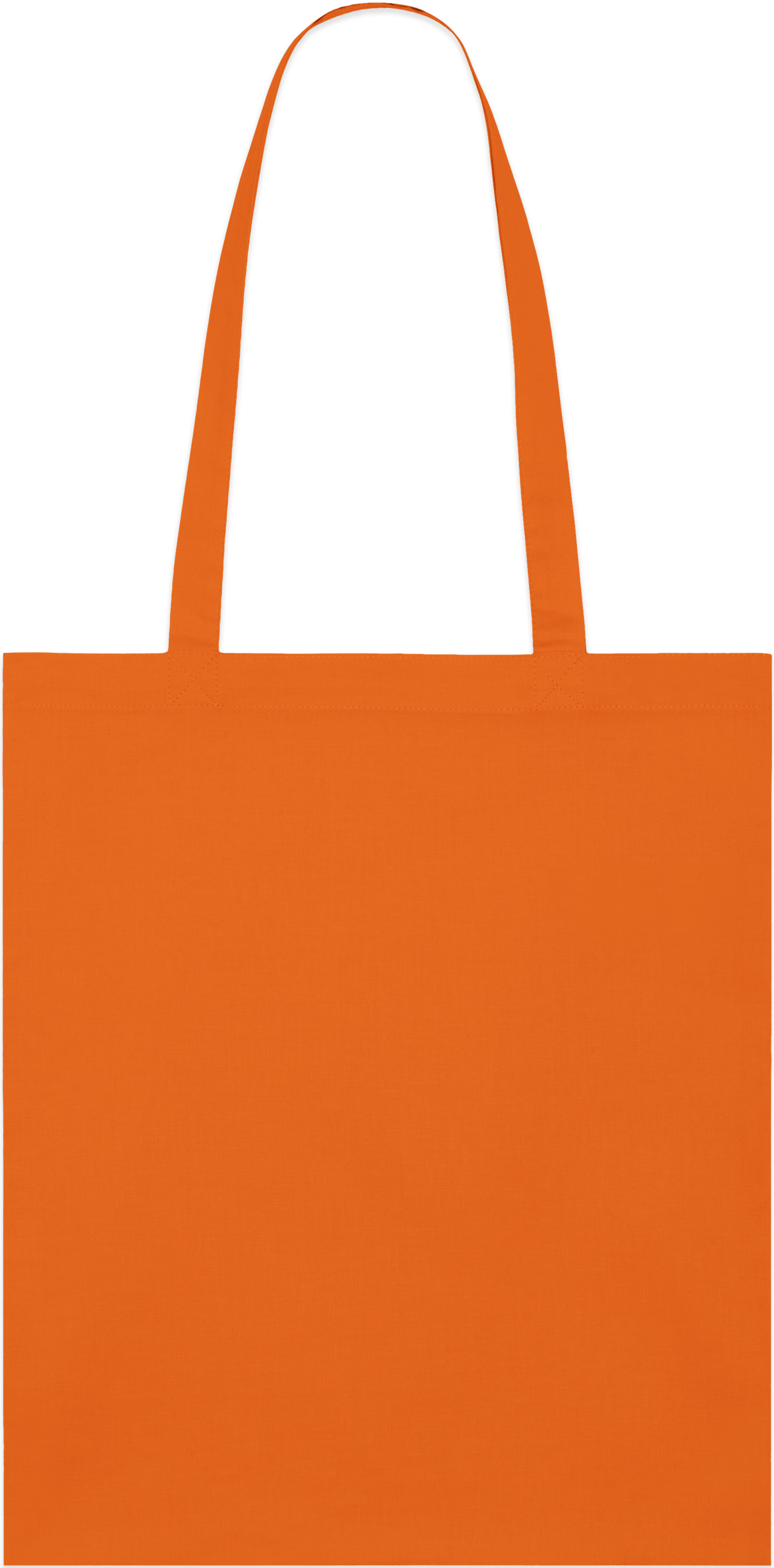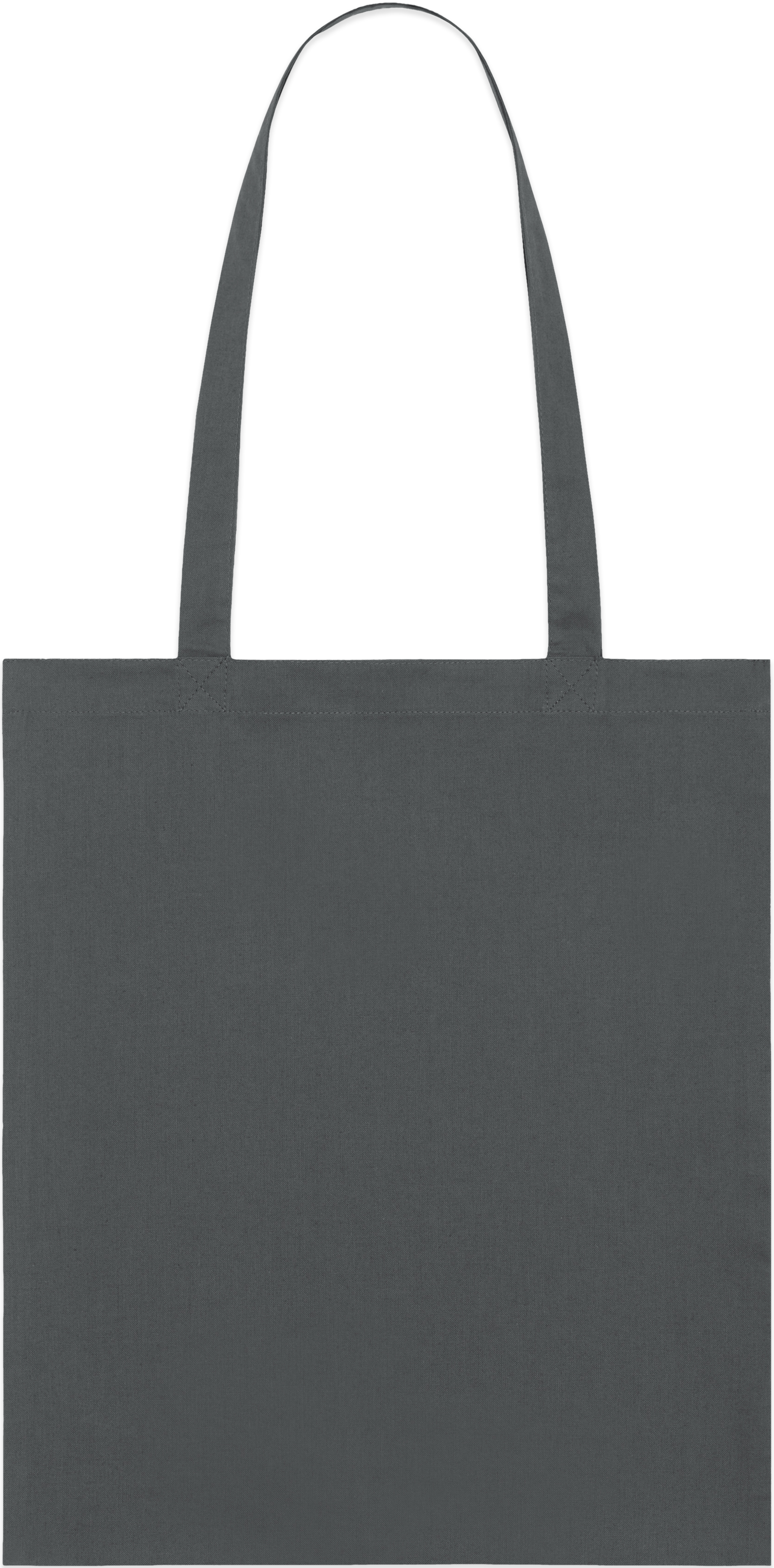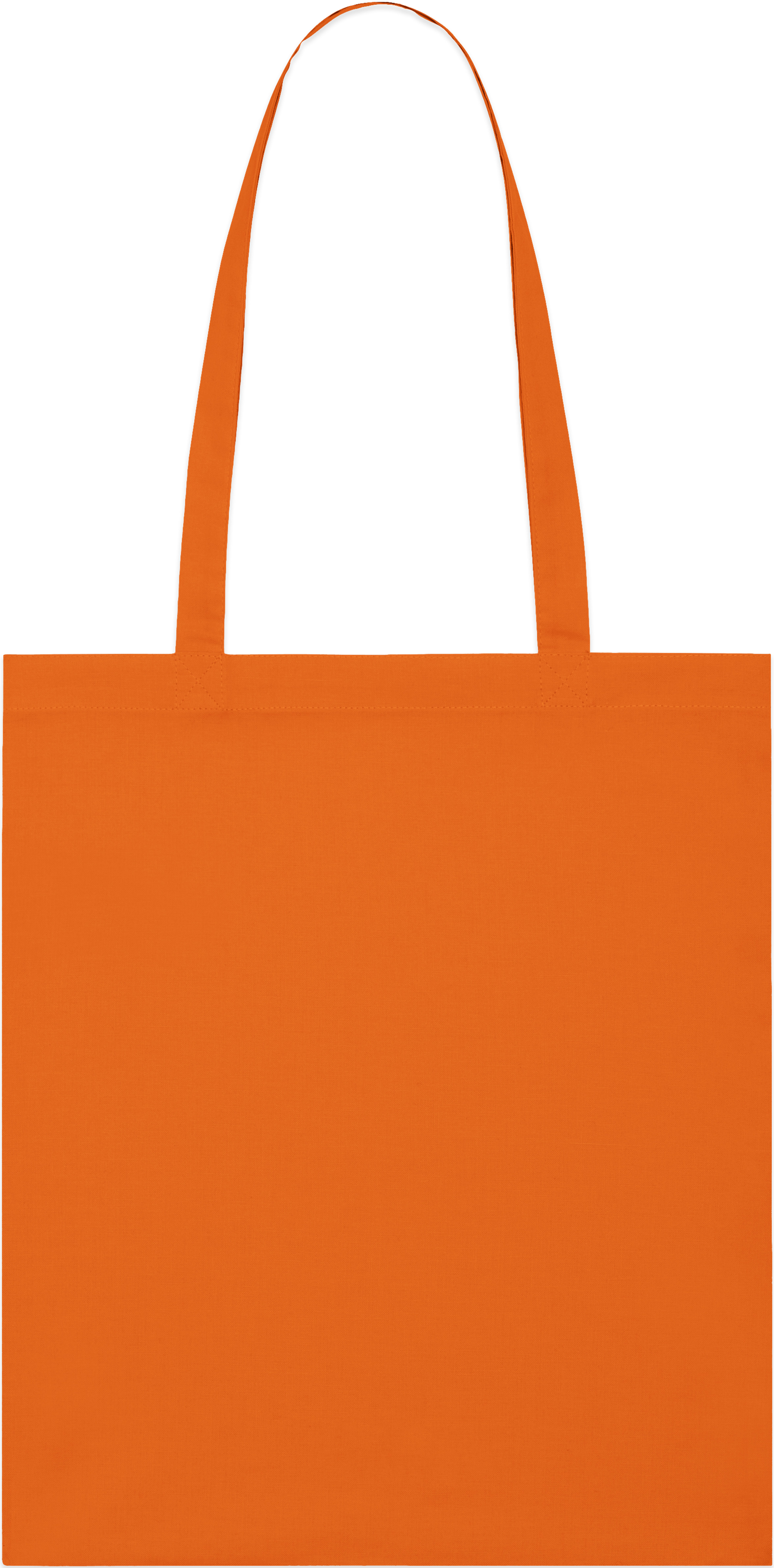 Light tote bag with top edge double folded for strength and clean finish. Long handles with reinforced cross stitch.
